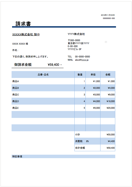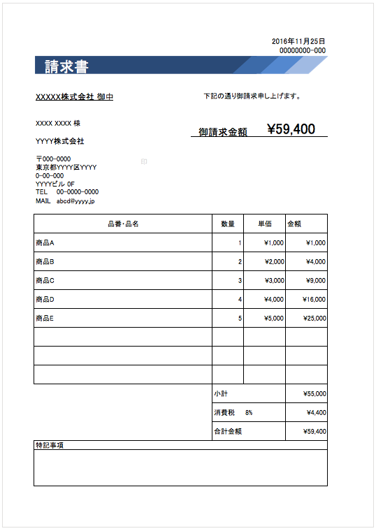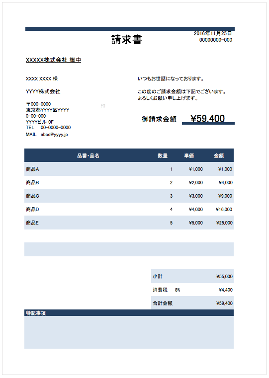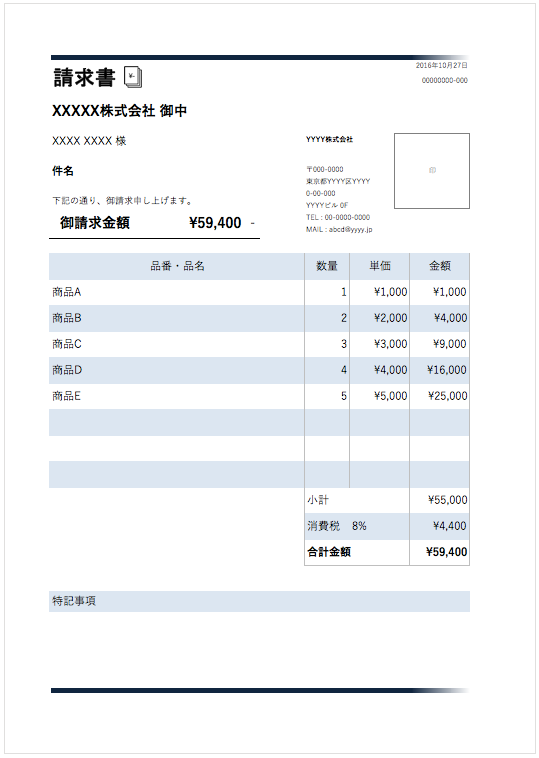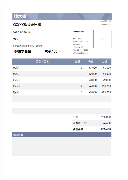 こちらは5つの中でもっともシンプルな請求書テンプレートデザインです。どれにするか迷ったらこちらがおすすめです。