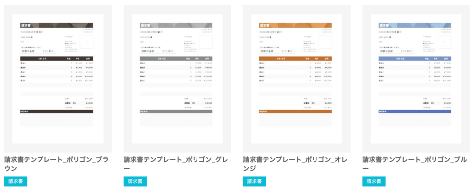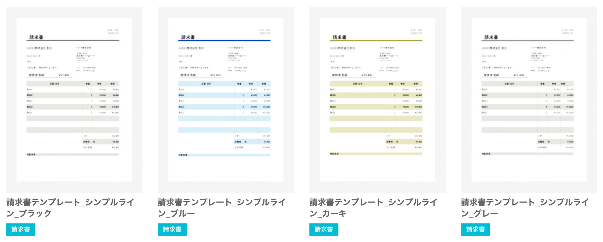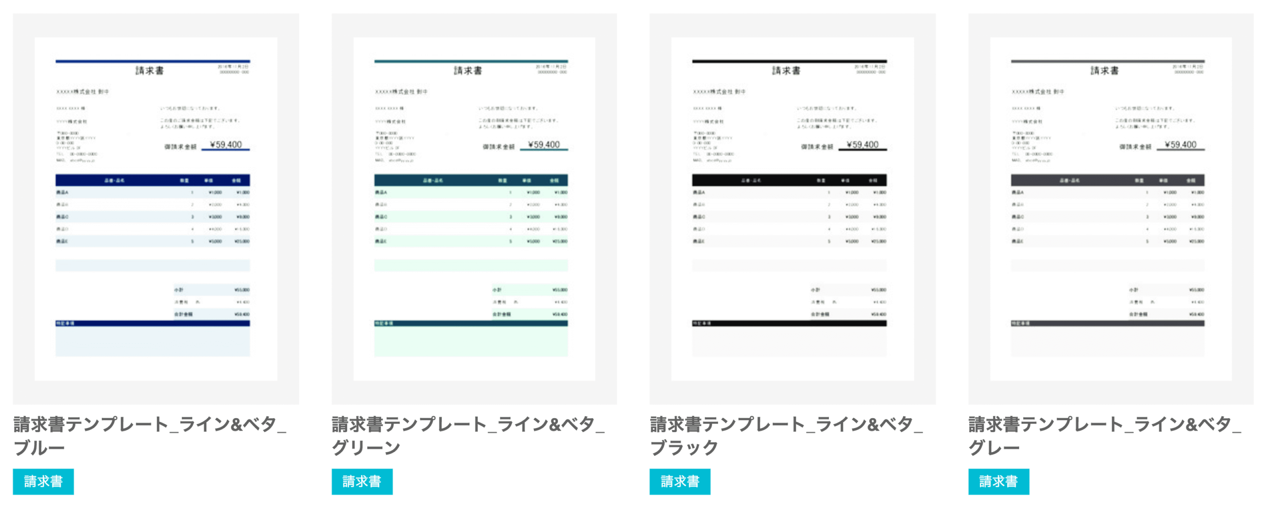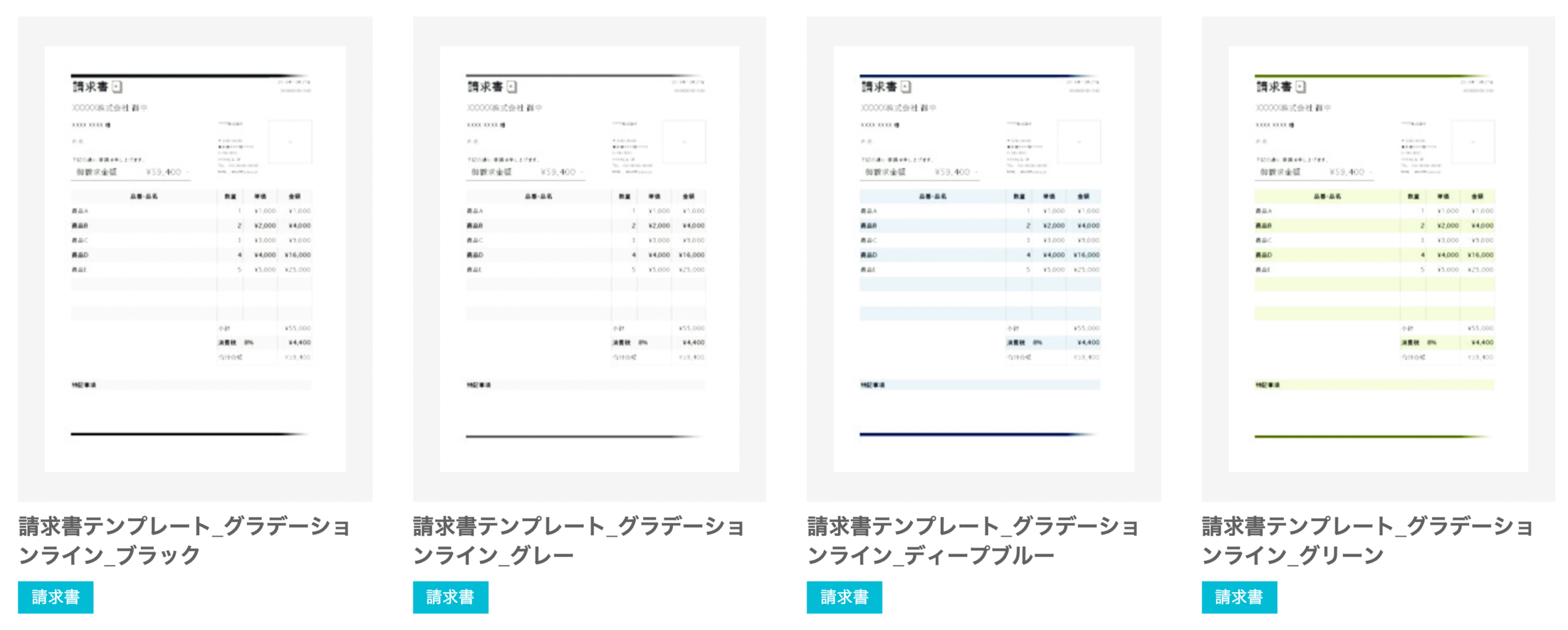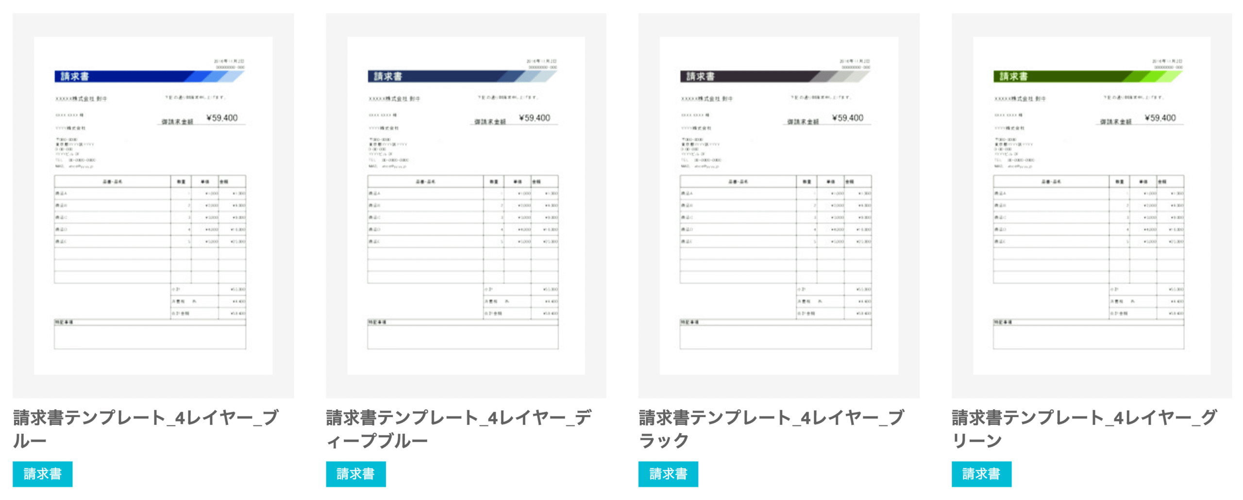 4色×5種類のテンプレートの中からお好きなデザインの請求書をダウンロードできます。