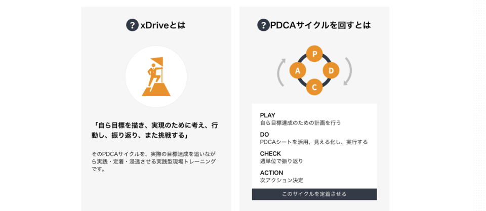xDrive は、「Play」「Do」「Check」「Action」のPDCAサイクルを定着させ、目的達成のための自信や達成意欲、目的意識、スピードアップにつながります。