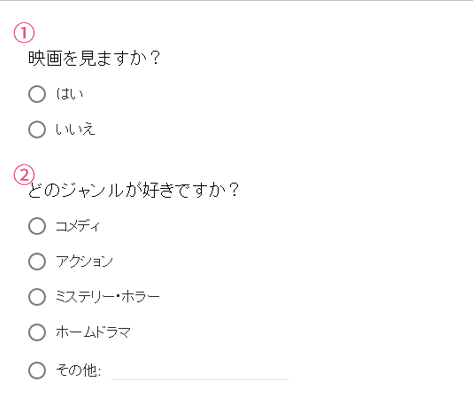 2の質問は、映画を見ている前提なので、映画を見ない人には質問したくありません。そのため、1の選択肢で「いいえ」を選択した人には、2の選択肢が表示されないようにします。