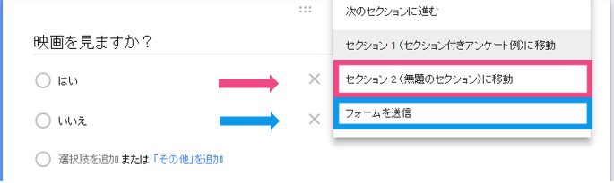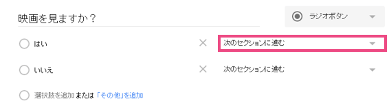 そこで、「はい」→「セクション2に移動」、「いいえ」→「フォームを送信」をそれぞれ選択します。