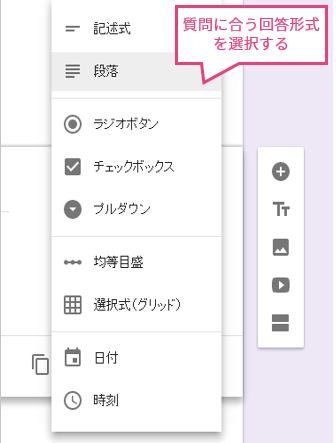 回答方法としておもに「ラジオボタン」「記述式」と「段落」に分けられます。入力した質問のタイトルから推測して、回答方法が自動的に選択されることもあります。