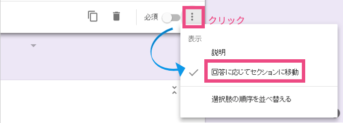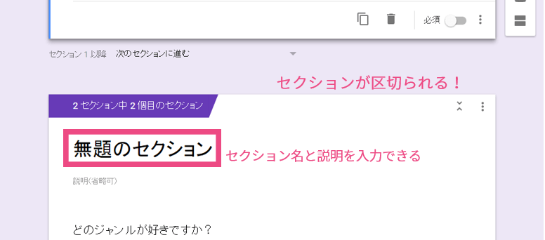 選択肢別によって表示するページを分岐できる機能があります。これには「セクション追加」を利用します。ページ分岐を設計する際は、どのような構造にしたいのかあらかじめ考えておきましょう。