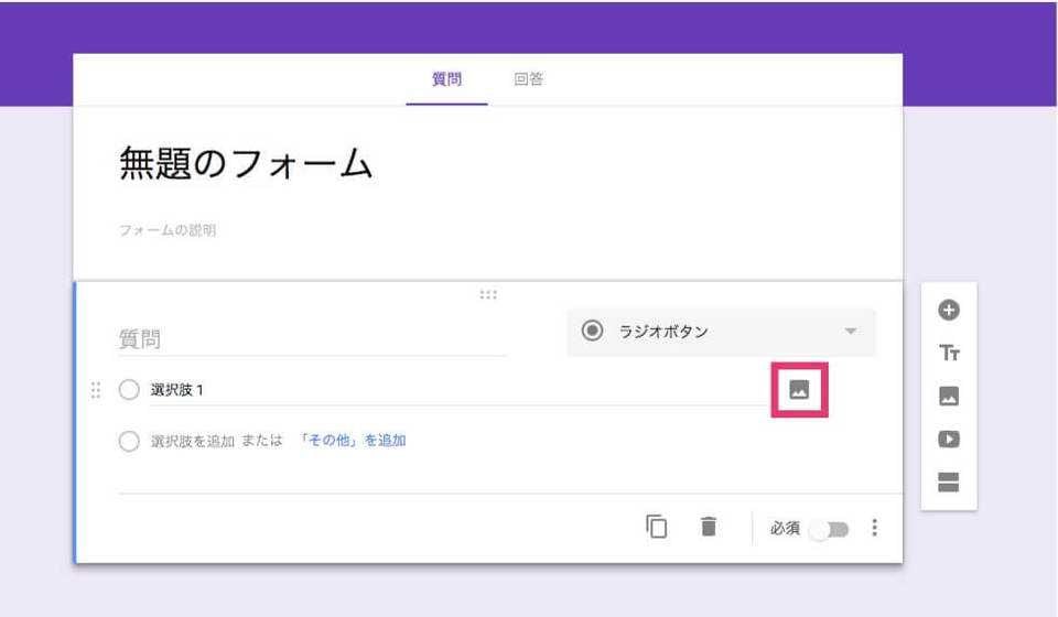 選択肢として画像を挿入するときは、選択肢横のボタンをクリックします。ボタンが表示されない場合は、カーソルを選択肢まで持っていくと、ボタンが表示されます。