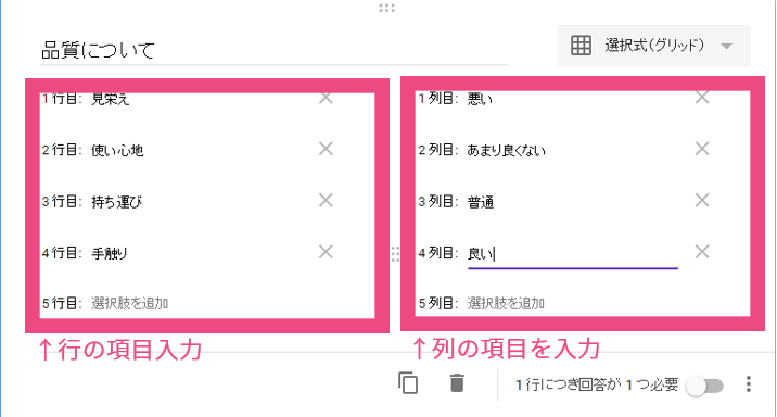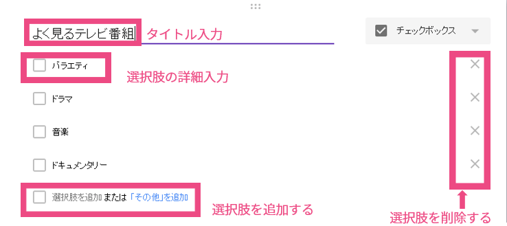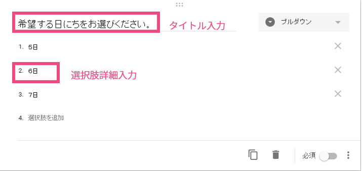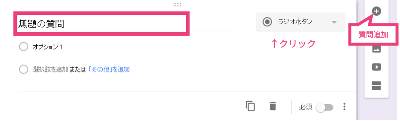 質問欄に、質問項目を記入します。右の+ボタンで質問を追加できます。