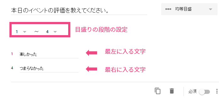「均等目盛」は、度合いを計りたいときに利用しましょう。たとえば、「楽しさを10段階で表すとどのくらい?」というような場合です。
