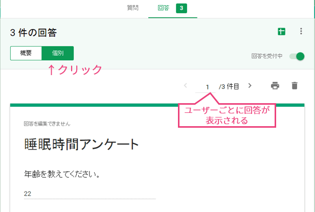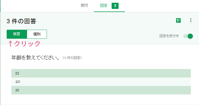 「質問ごとに回答を確認」と同様に、「回答」をクリックしたあと、「個別」をクリックします。