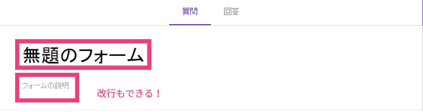 「無題のフォーム」にはフォーム全体のタイトルを、「フォームの説明」にはフォーム全体の説明文を入れます。