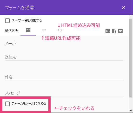 「送信」をクリックすると、フォームをメールやSNS(Facebook、Twitter)で共有できます。