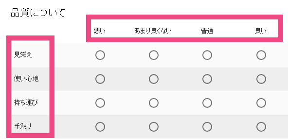 「選択式」は、「はい、いいえ、どちらでもない」という答えが必要な設問に使われ、複数のアイテムを段階で評価させる場合に利用します。