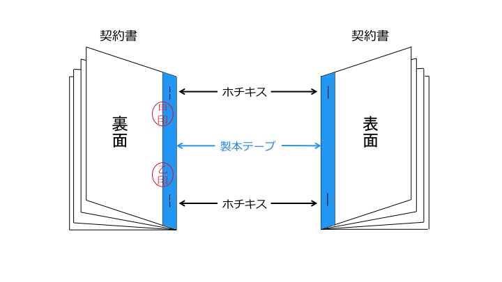 製本された契約書の表紙か裏表紙のどちらか一方に、袋とじ部分や製本テープにかかるように契印を押印するだけでかまいません。