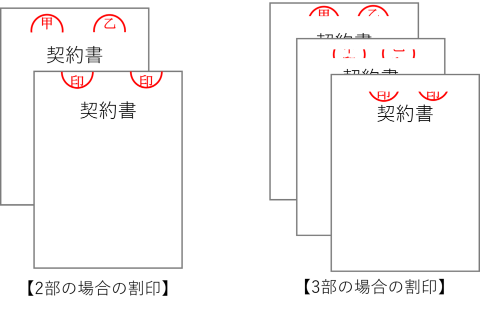 契約書の割印は、それぞれの契約書上部に、書類を重ねた状態で縦と横に少しずらして、印影が重ねた部分にまたがるように押します。2名以上の場合は全員分の押印が必要です。