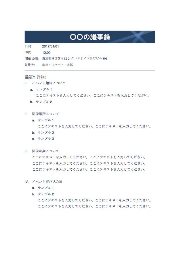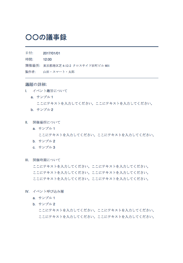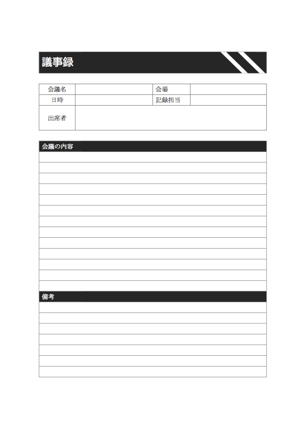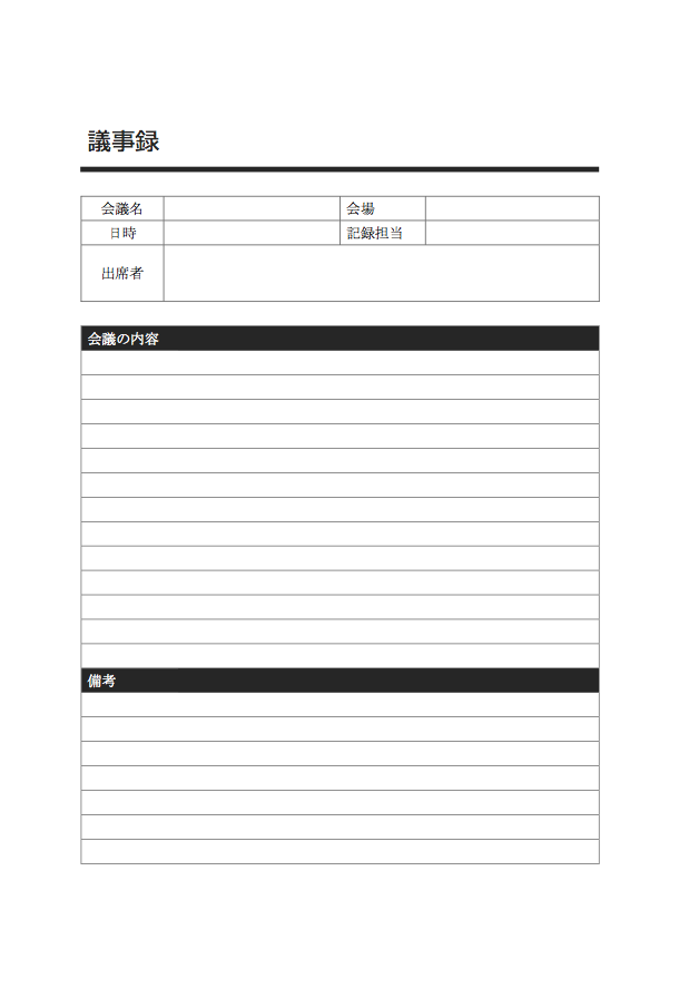 基本的なポイントを押さえているフォーマットなので、議事録初心者でも安心して使えます。