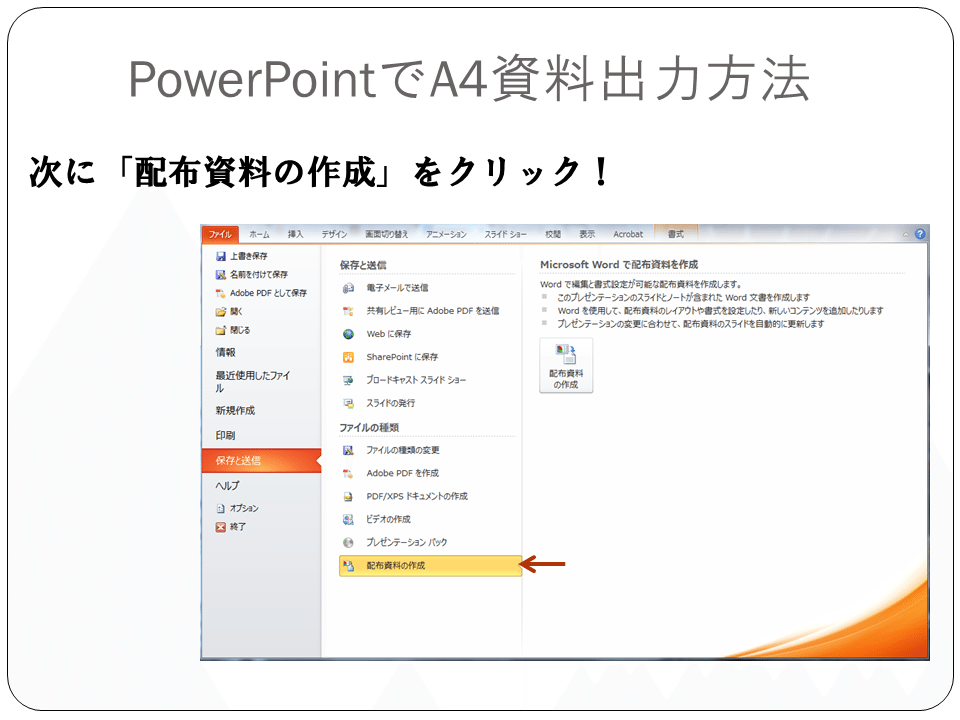 PowerPoint 2013以降の場合は、「保存と送信」ではなく「エクスポート」をクリックすると、配布資料の作成が表示されます。