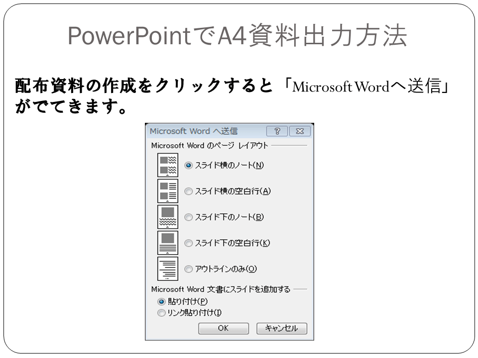 Wordへ変換する際、ノートをスライドの横または下のどちらに配置するか選べます。また、ノートの代わりに空白行の挿入も可能です。