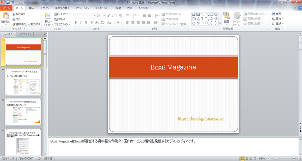 今回は、次のPowerPointスライドをWord資料に変換します。