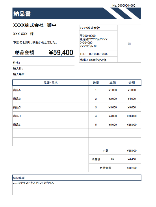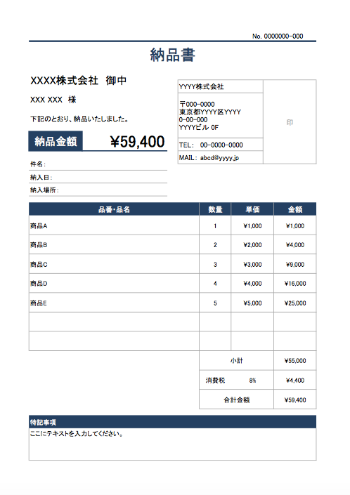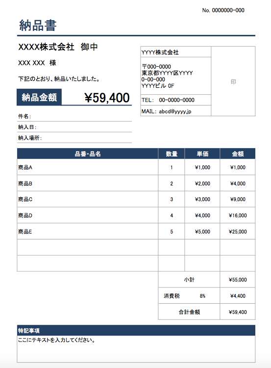 Excelで簡単に使える、さまざまなデザインの納品書フォーマットが無料でダウンロードできるので、ご活用ください。