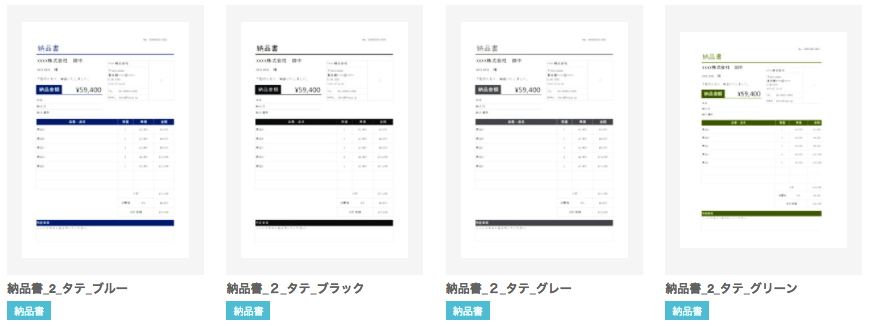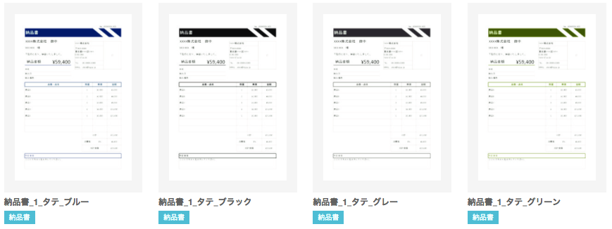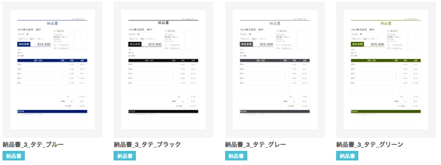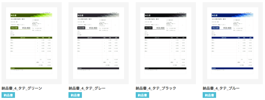 4色×4種類のテンプレートの中からお好きなデザインのフォーマットをダウンロードして、本記事を参考に納品書を発行してください。