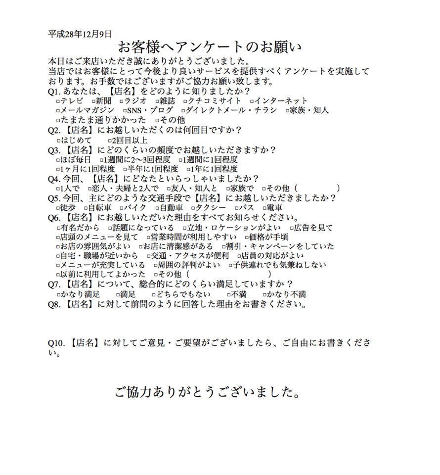 顧客満足度を調査したい事業者、またはオーナーは残念なことに、アンケートの質問項目数が多い傾向が見られます。親切な方でしたら、すべての質問に対し答えてくれることでしょう。