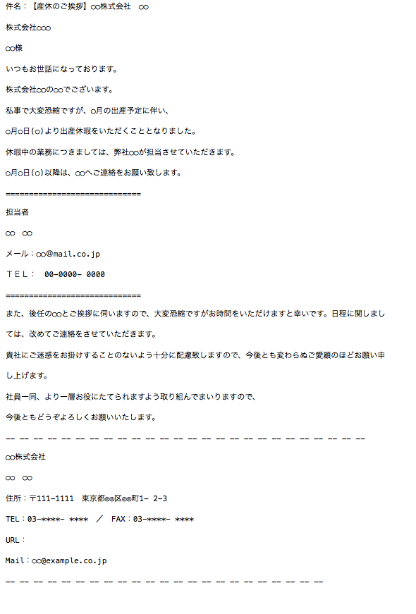 あとは、自分が産休に入ることで取引先に迷惑が掛からないよう配慮するという内容と、今後とも変わらない取引をしていただけるようにというお願いが書かれていれば問題ないでしょう。