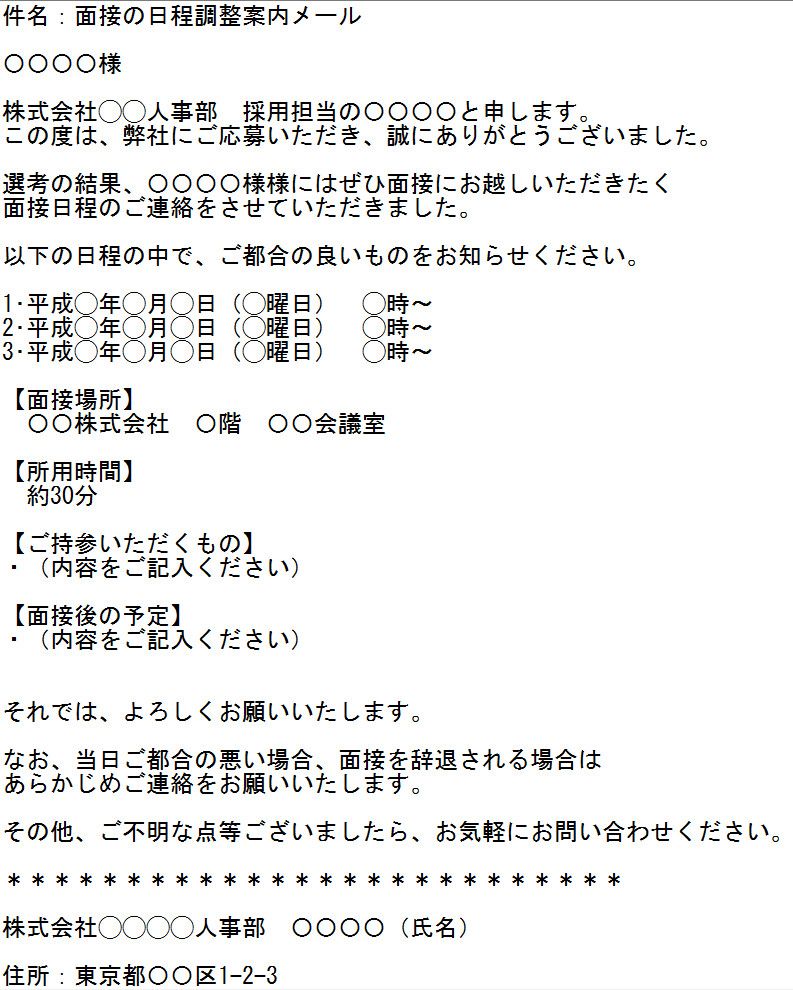 これで新卒応募者の面接等の日程案内に関するメールを送る際は安心できますね。