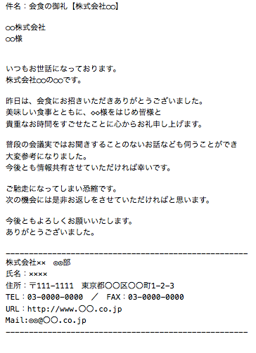 件名:〇月〇日会食の件 〇〇株式会社〇〇より(件名は短く、送信者が分かるように件名に書いておきましょう)