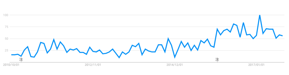 次の図はGoogle トレンドでの検索数の変化を表しているものです。検索数は徐々に増えており、2014年ごろから大きく伸びています。この図からもBtoBマーケティングが注目されていることが伺えます。