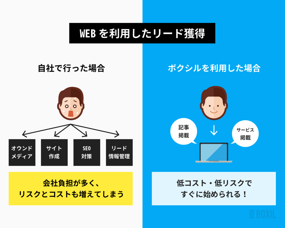 ボクシル を使うことで、自社でオウンドメディアを構築・集客するよりも低コスト・低リスクでリード獲得が可能となります。上記の失敗例のようなリスクやコストを心配する必要はありません。