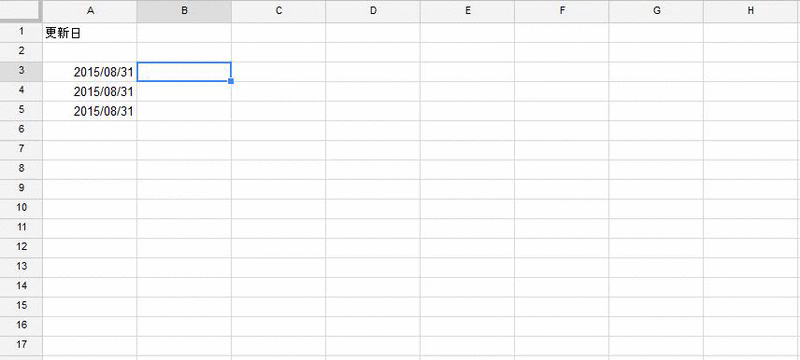 保存が完了したらタブ(もしくはウインドウ)を閉じます。手順どおり作成すると、下のように操作できます。A行以外に文字を入れると、反応してA行に日付が入るはずです。