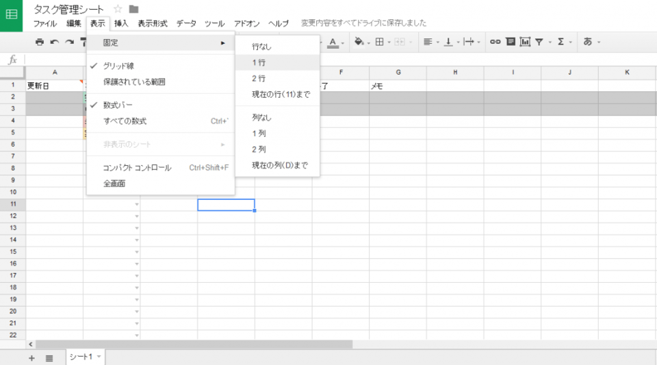 スプレッドシートの「ウィンドウ枠の固定」または「行の固定」と呼ばれる機能を使った作業です。スクロールしても項目欄が常に表示されるように、一番上の行を固定します。作業は1つのみです。