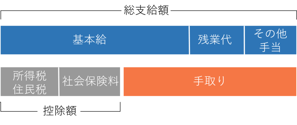 総支給額は、基本給と各種手当(役職手当・家族手当・通勤手当・住宅手当・残業代など)を足し合わせた金額です。