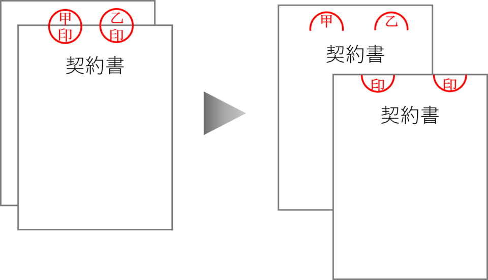 割印とは2通以上の契約書を作成し双方で保管する場合に、契約書が同一のものであることを証明するための押印です。割印は、2つの契約書をずらして並べて、2つの契約書にまたいで押印します。