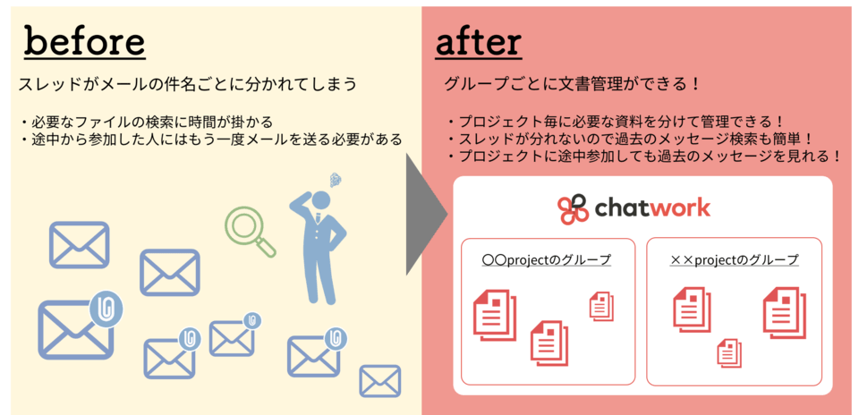 今まではプロジェクトに必要な書類はメールで都度添付し送付していました。チャットワークでは、毎回使うような資料は概要テキストにURLを記載したり、ピン留めをすることでいつでも簡単に開くことができ、都度検索して探すことがなくなりました。