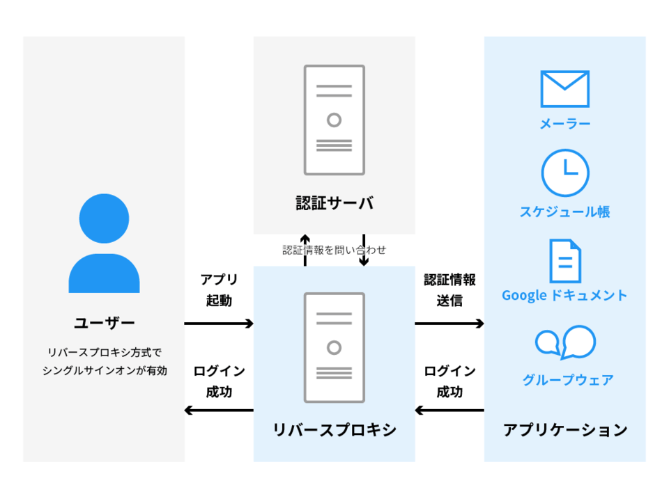 ブラウザとWebアプリケーションサーバーの間に「リバースプロキシ」サーバーを設置し、「リバースプロキシ」サーバーにエージェントソフトを導入することで、シングルサインオンを実現します。Webブラウザからのアクセスは、まず「リバースプロキシ」サーバーに届き、その後Webアプリケーションサーバーに中継されます。