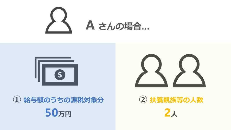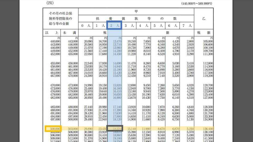 たとえば、Aさんという給与所得者について考えます。彼には専業主婦である妻と中学生の子供が1人いたとすると、扶養親族等の数は2人になります。さらにAさんの月の給与が50万円(社会保険などの控除後の金額)だったとすれば、これを源泉徴収税額表に当てはめると、次のようにAさんの源泉所得税額がわかります。