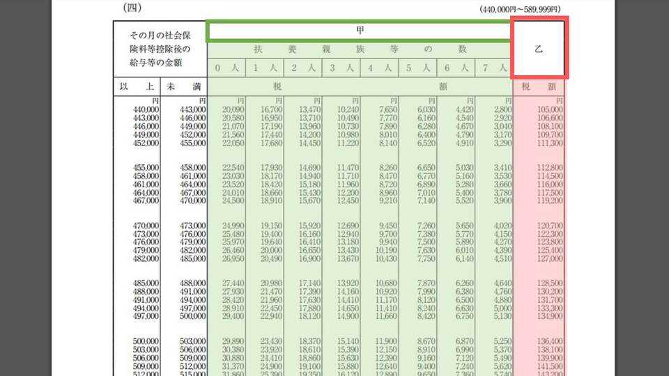 ちなみにその隣に「乙欄」もありますが、これは上記の申告書を勤務先に提出していない場合に使用されます。たとえばAさんが複数の勤務先をもっている場合に、主な勤務先には申告書を提出して甲欄で源泉所得税を算出し、2つ目の勤務先では乙欄を使用して税額が決められるということになります。