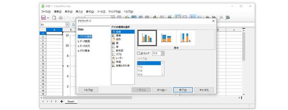 棒グラフから扇グラフ、折れ線、散布図、レーダーチャートなど、さまざまなグラフを作成できます。個人的な利用から大人数でのデータ管理にまで幅広く対応しているのが特徴です。Libre Officeの他のアプリから呼び出して使います。