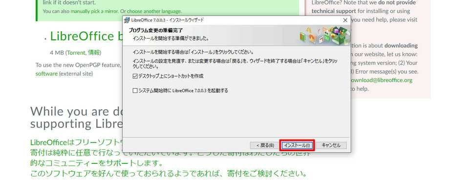 「インストール」をクリックするとパソコンにインストールが開始されます。