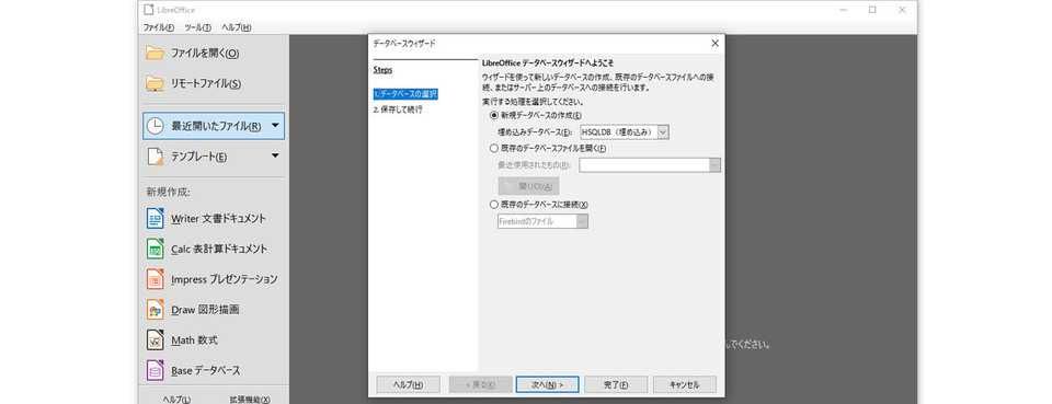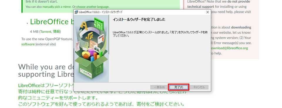 正常にインストールされると「インストールウィザードを完了しました」と表示されます。「完了」をクリックするとLibre Officeが使えるようになります。