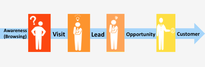 具体的に顧客の行動を段階分けすると、それぞれ「Awareness(Browsin)」・「Visit」・「Lead」・「Opportunity」・「Customer」の段階があり、これを順番に経ることによって、最終的に潜在顧客が優良顧客へと転換していきます。それでは一つひとつ解説していきます。