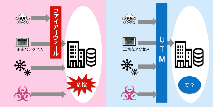 これによって単純なファイアウォールだけでは防ぐことの難しい脅威からも、PCやネットワークを守るのがUTMの役割だといえるでしょう。