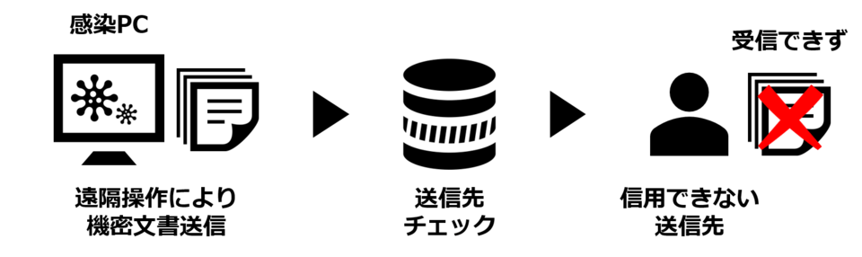 フィルタリングソフトはセキュリティの面でも力を発揮します。たとえば、社内のPCが遠隔操作型の マルウェア に感染した場合、遠隔操作により機密文書が流出する危険性があります。しかし、フィルタリングソフトを利用していれば、信頼されていない送信先はブロックされ、情報漏えいを防げます。