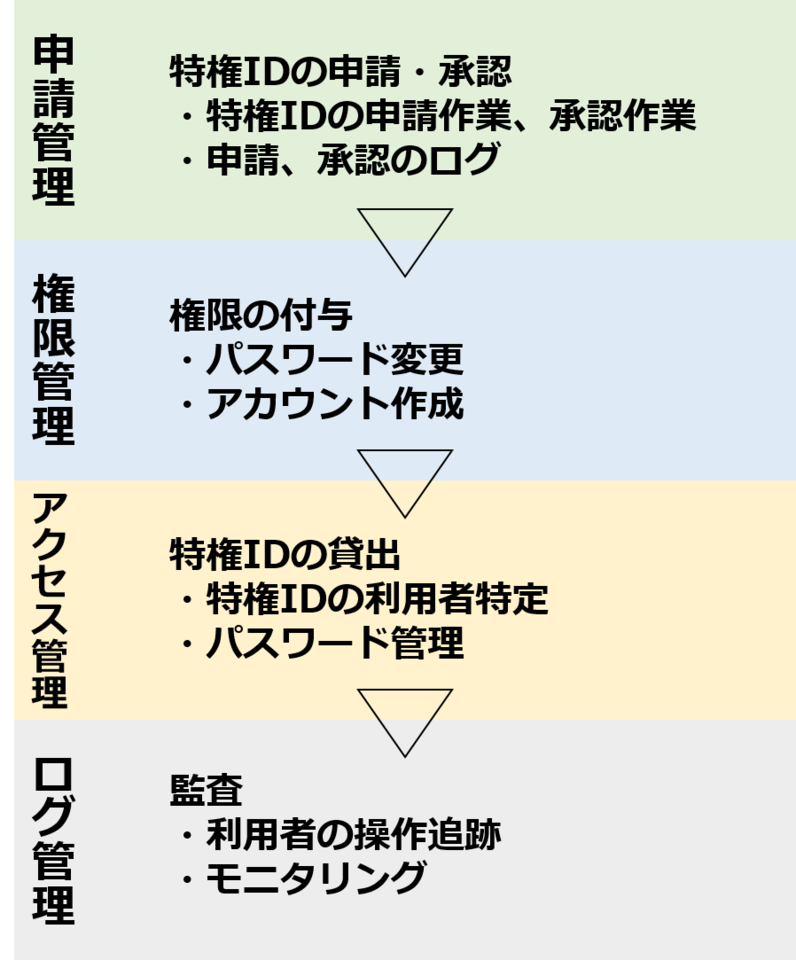 そのため、利用申請・承認、IDの払い出し・アクセスログの記録など、特権ID管理におけるプロセスを適切に行うことが重要です。