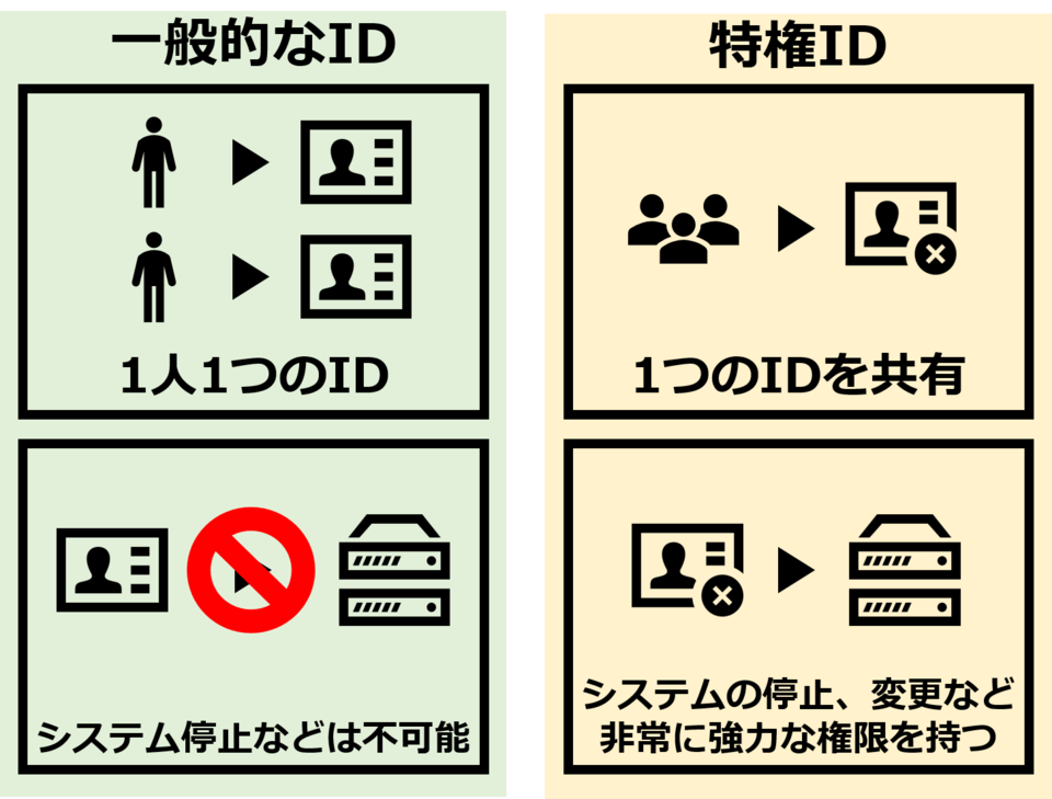 一方、特権IDはシステムの仕様変更ができるほど強い権限をもっているので、悪用されるとシステムに甚大な被害を被る可能性があります。