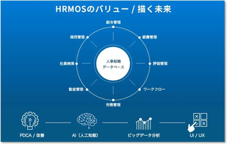 HRMOSの構想としては、採用管理システムや勤怠管理システム、人事評価システムなどの中心に人事データベースを置いています。今後は、採用だけでなく実際に採用した後どのように活躍し、どのような評価を受けているのかを1つのデータベースに蓄積し、データを活用することで、その人自身が輝ける適材適所への配置や人材活用ができるようになると思っています。