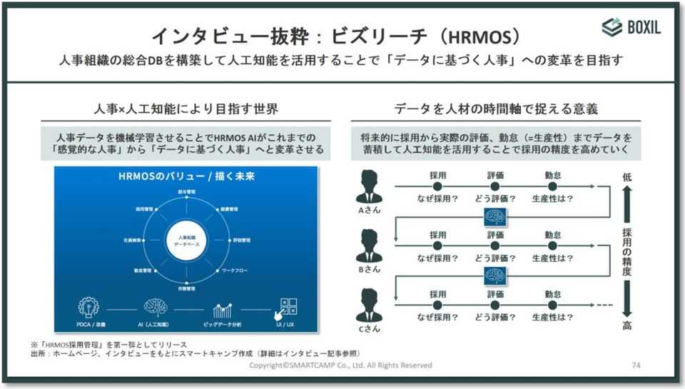人工知能の活用はSaaS業界において大きなトレンドになっていますが、HRMOSの面白さは人財の採用から採用後の質・量的なパフォーマンスの測定(今後実装予定の評価管理や勤怠管理機能による測定)まで行うことで、どのような理由で採用した人が1年後、2年後、数年後にどのような評価を受けたのかといった「時間軸」のあるビッグデータを蓄積していこうとしている点です。