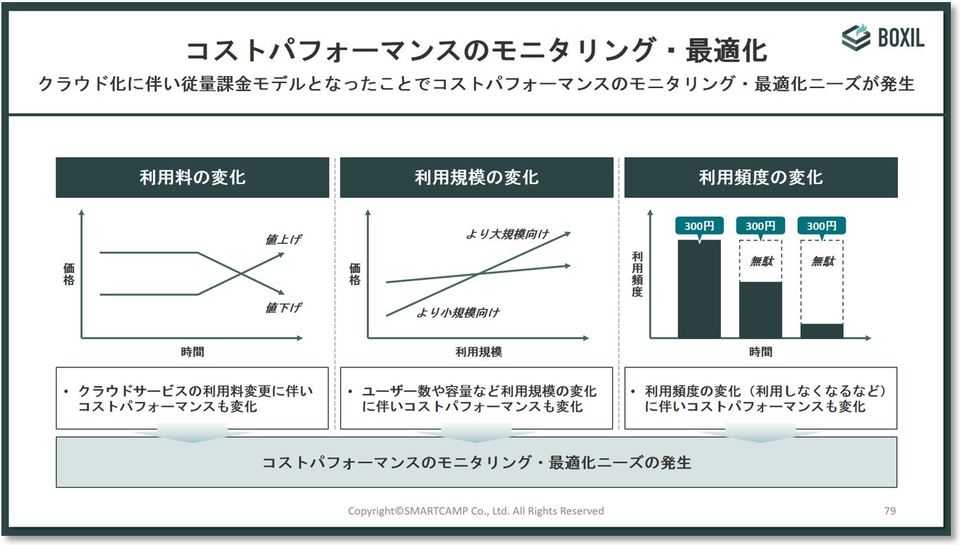 このコストモデルの転換に伴い、オンプレミスでは生まれづらかったコストパフォーマンスのモニタリング・最適化ニーズが生まれました。クラウドでは利用料の変化、利用規模の変化、利用頻度の変化によってコストパフォーマンスが刻一刻と変化するようになったからです。