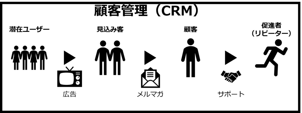 潜在ユーザーに対して広告を通して名前を知ってもらうことや、現在の顧客を促進者にすることも顧客管理システムに含まれます。