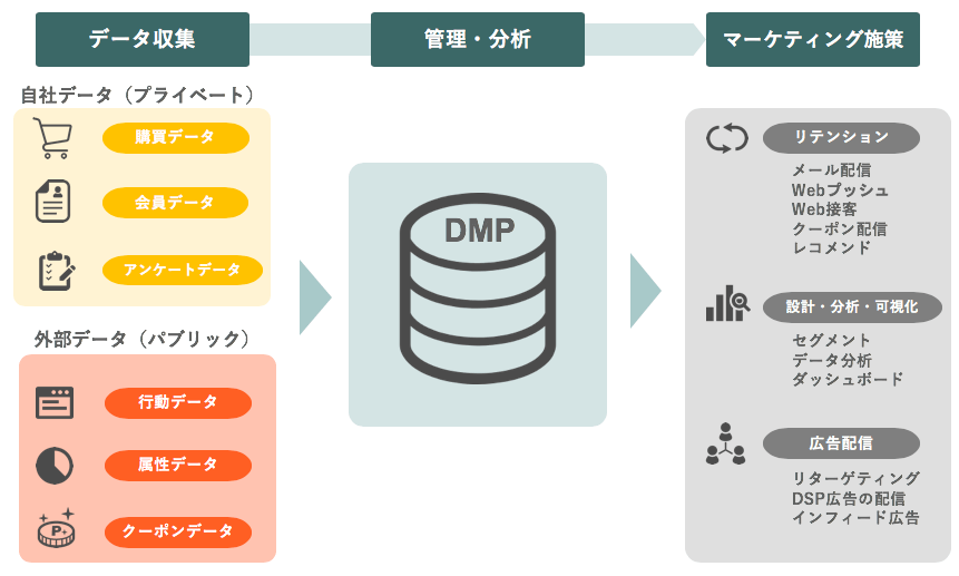 プライベートDMP は先ほど触れたとおり自社サイトに関するマーケティングデータです。主なデータとしては会員や顧客情報・購買履歴・サイト訪問者のアクセスログなどが挙げられます。