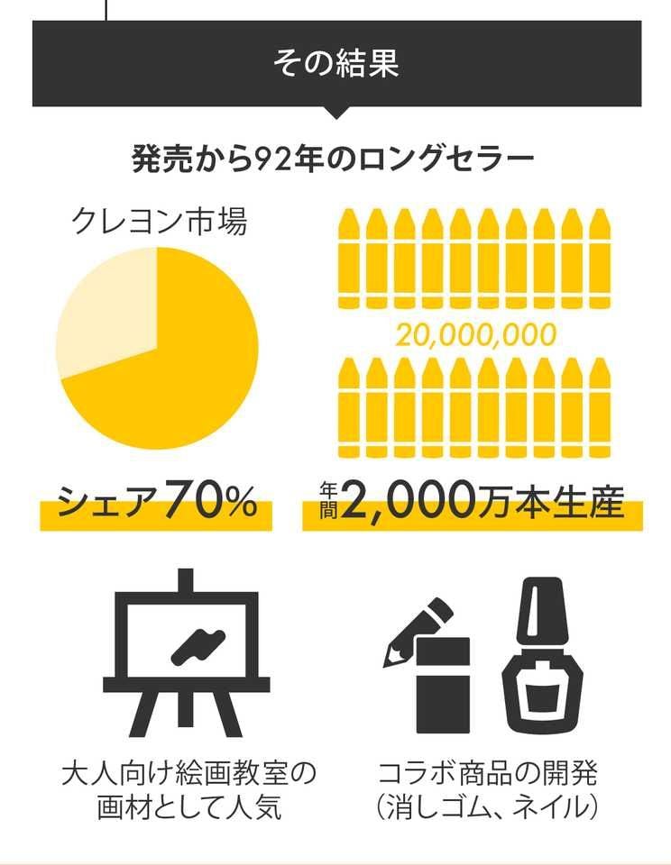 当時は、模倣品が出回るほどの人気だった。年間で2,000万本以上を生産する。クレヨンすべての市場で7割を超えるシェアを誇っている。